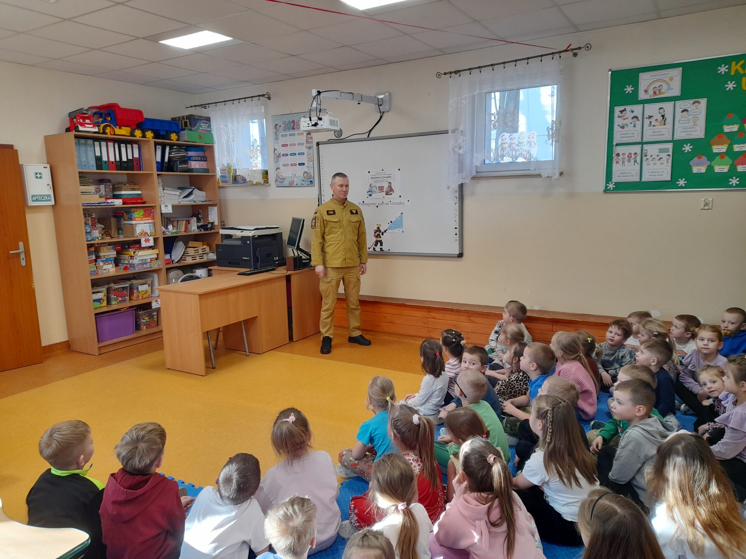 26.02.2026 r. w ramach projektu „Akademia Zawodów” nasze przedszkole odwiedził tata Dawidka z grupy maluszków – pan Robert Jałocha, który na co dzień pełni służbę w PSP Warszawa. Podczas spotkania przybliżył dzieciom niezwykle odpowiedzialny i odważny zawód strażaka.