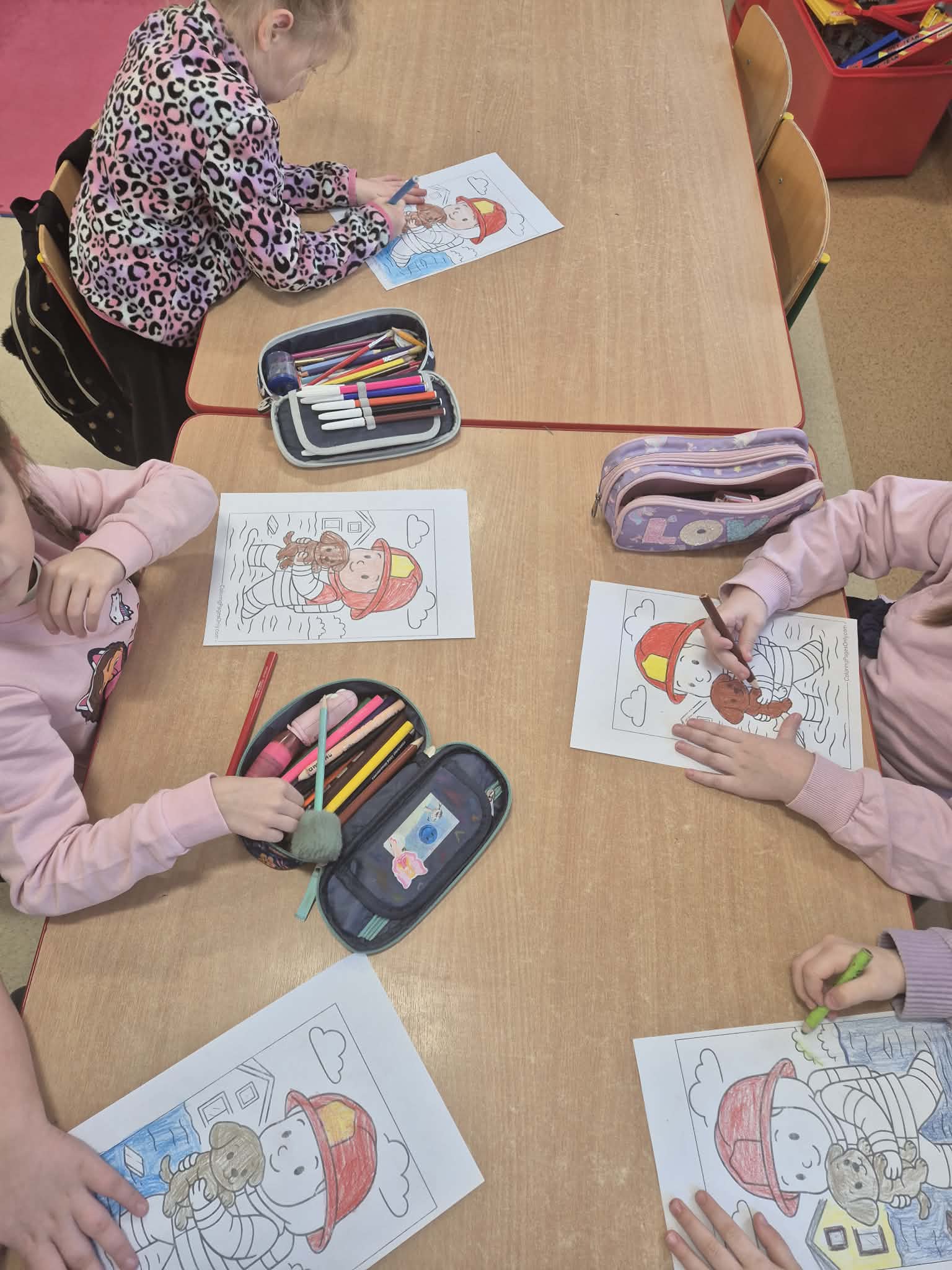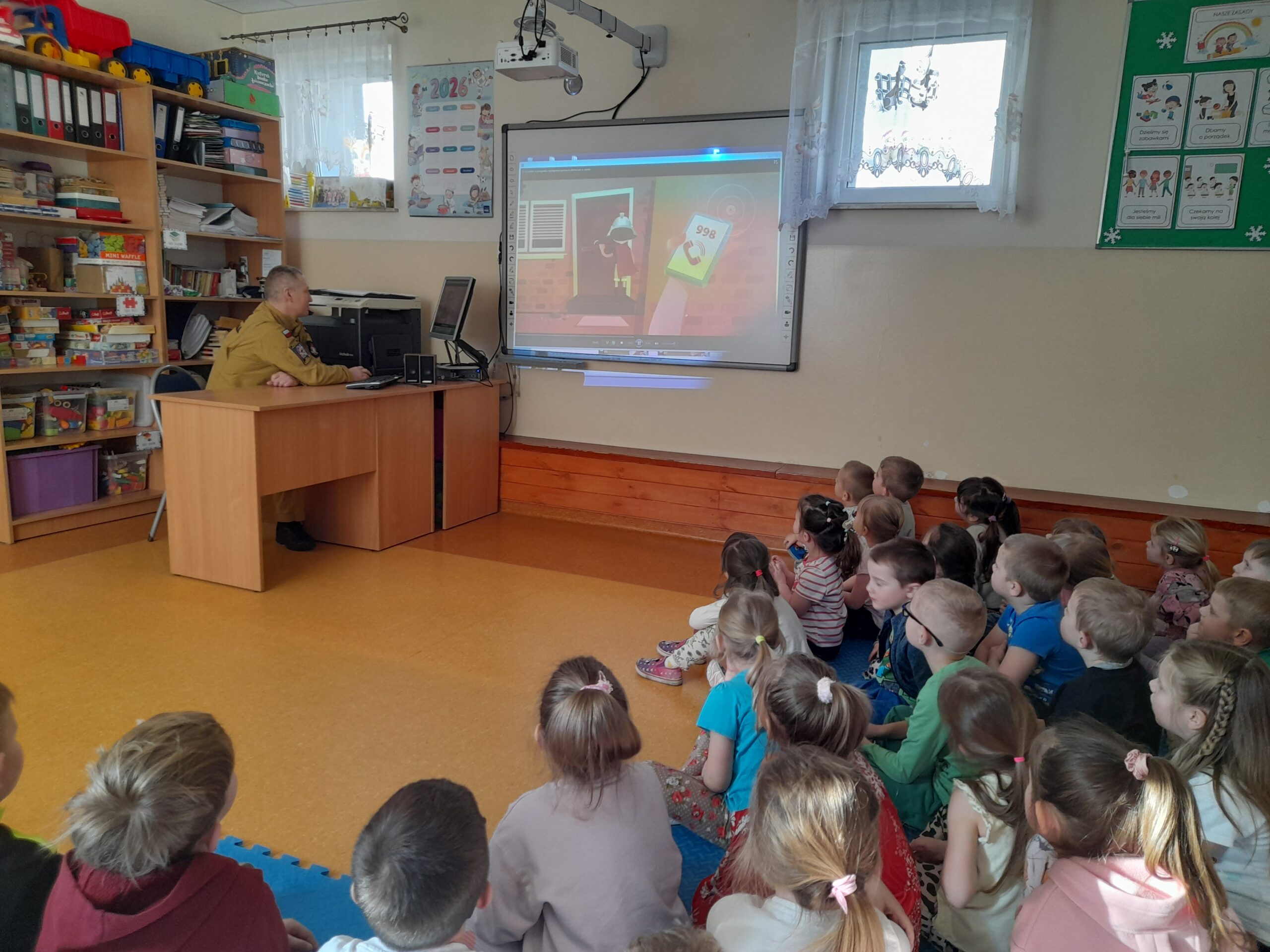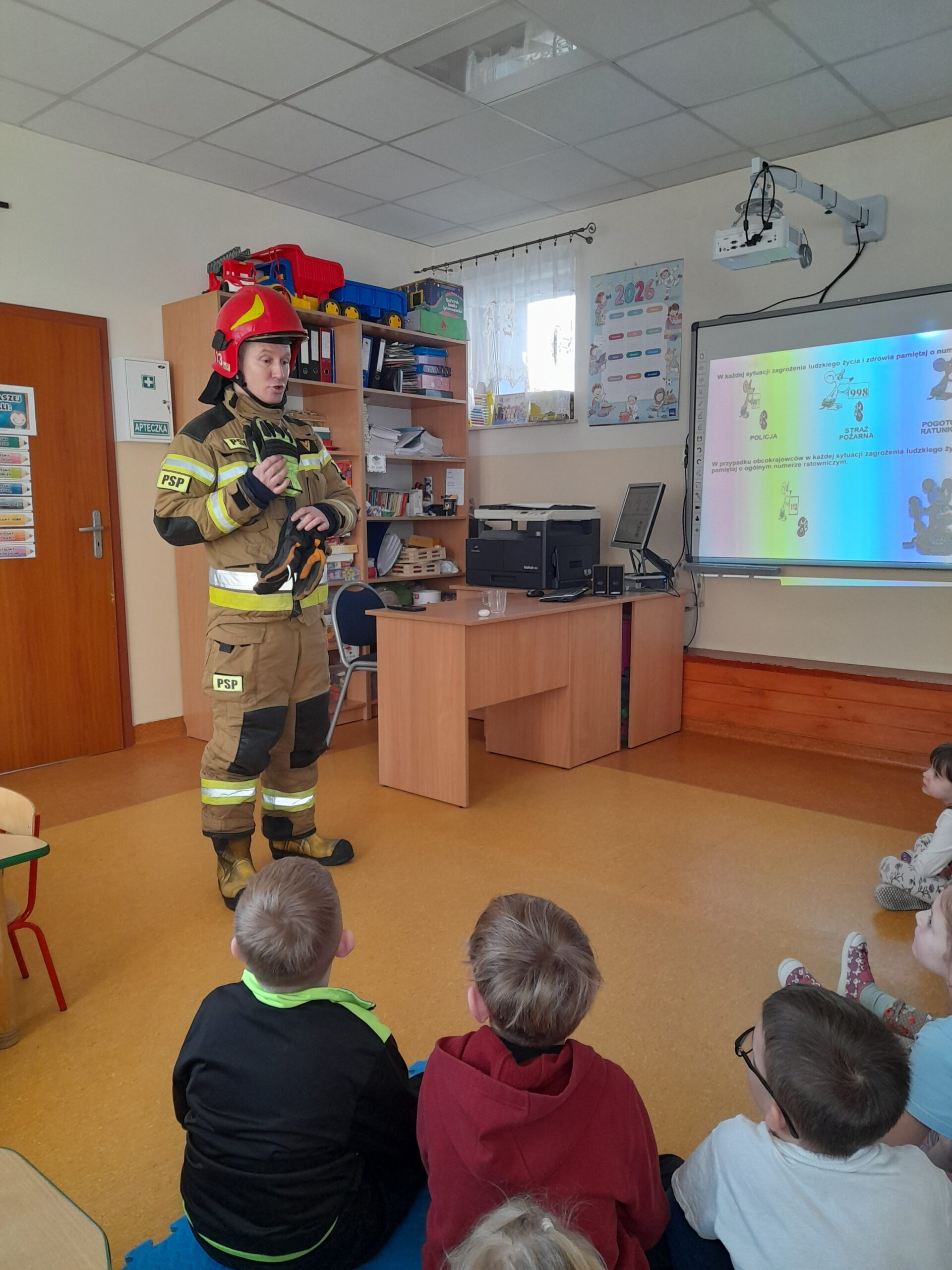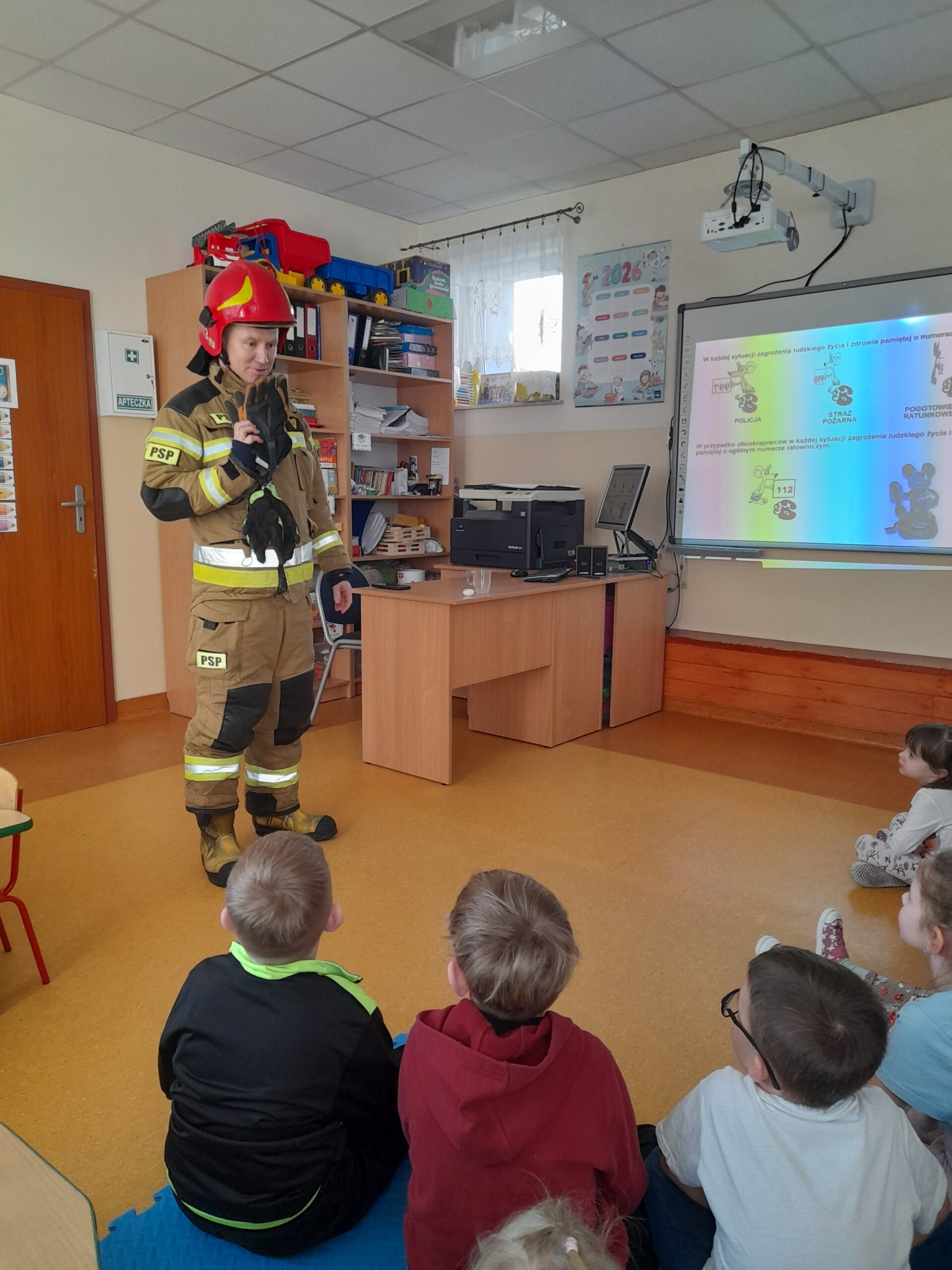 Przedszkolaki z dużym zainteresowaniem słuchały, na czym polega praca strażaka oraz w jakich sytuacjach niesie on pomoc – nie tylko podczas pożarów, ale również w wypadkach czy innych zagrożeniach. Wspólnie przypomnieliśmy sobie numery alarmowe oraz zasady właściwego zachowania w sytuacjach niebezpiecznych.