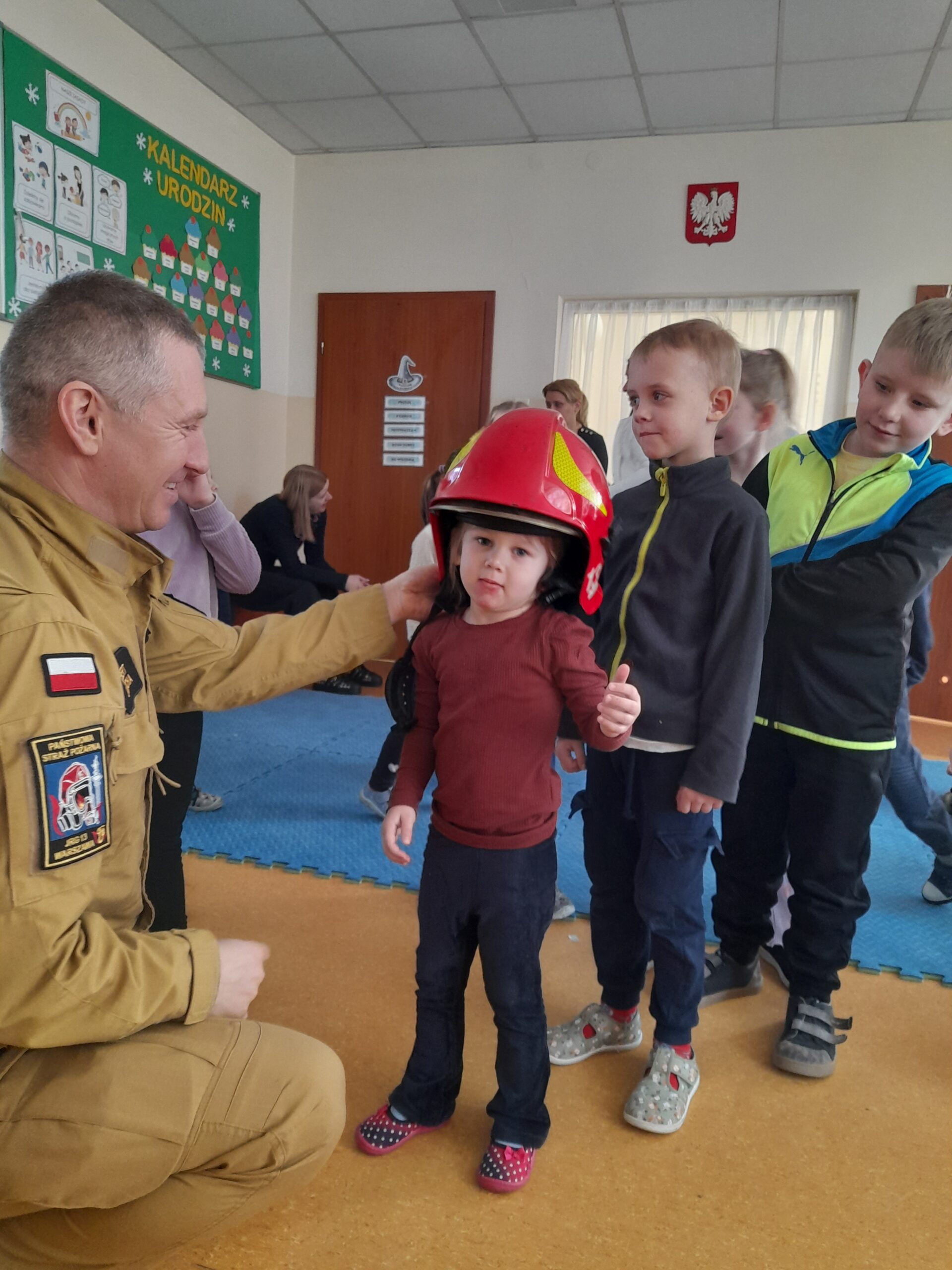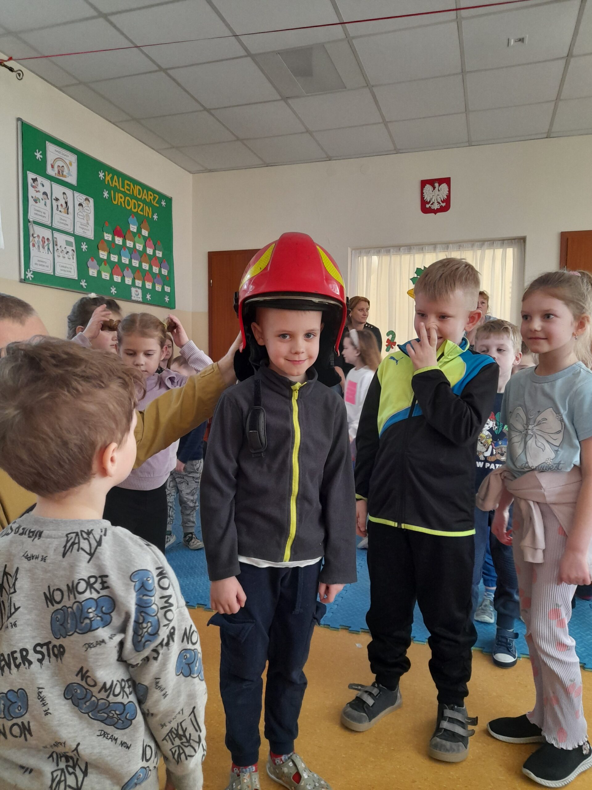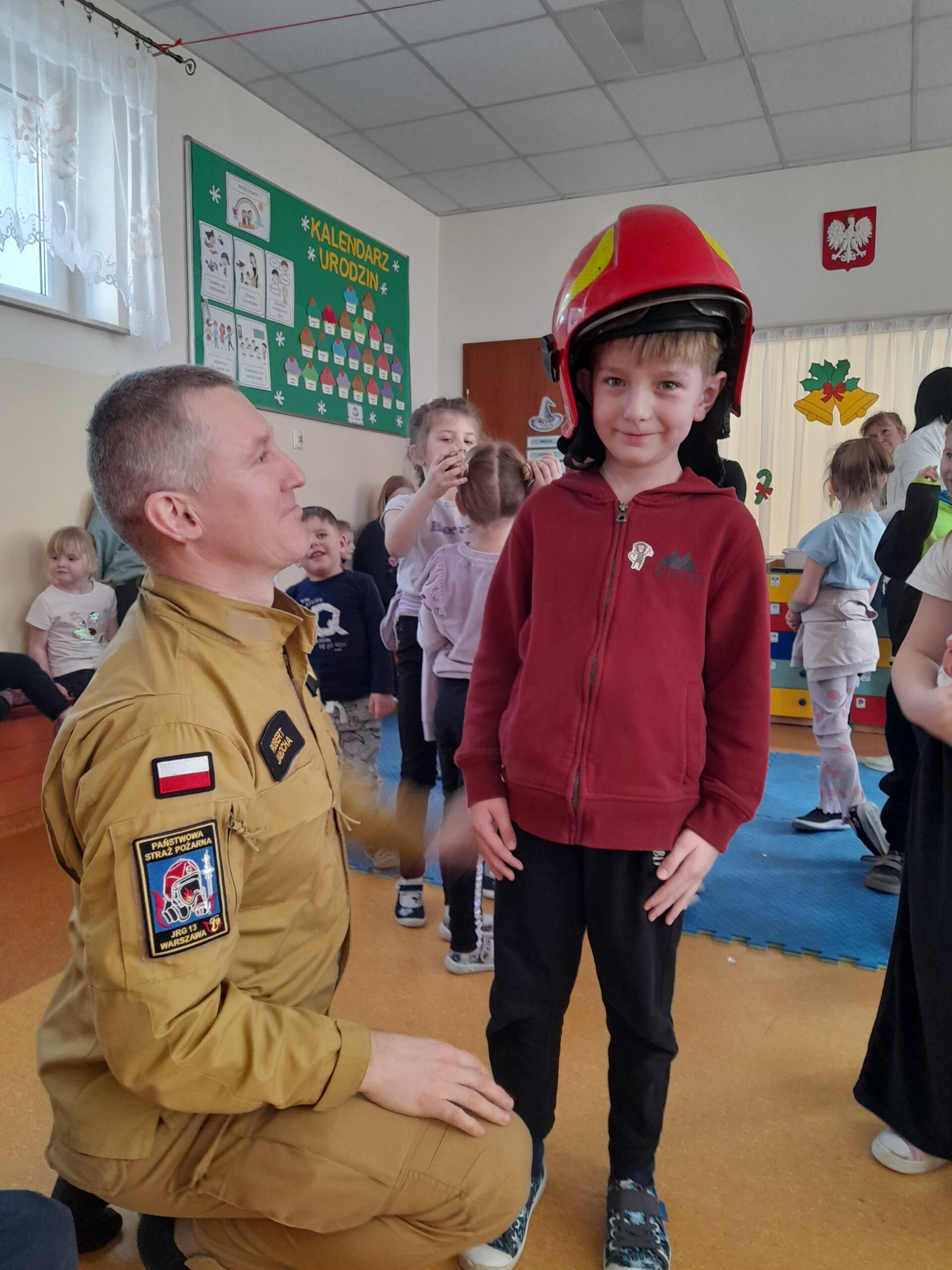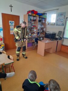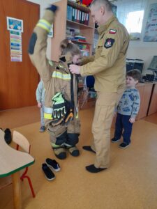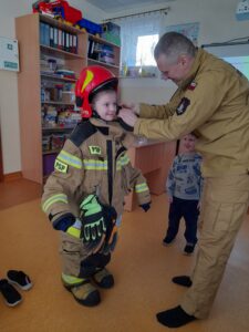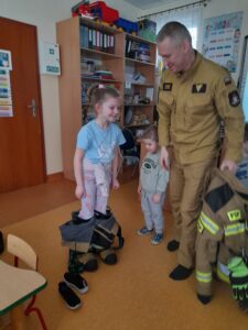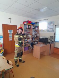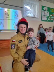 Na zakończenie dzieci mogły obejrzeć z bliska elementy stroju strażackiego, a nawet przymierzyć hełm. To była nie tylko ciekawa lekcja, ale także inspirujące spotkanie z prawdziwym bohaterem codzienności. Serdecznie dziękujemy za wizytę.