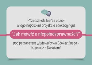 Aktualności Projekt Bee Quest – ekologiczne zajęcia dla najmłodszych Otwórz artykuł REKRUTACJA 2026/2027 Otwórz artykuł Wyjazd dzieci na spektakl „Pinokio” Otwórz artykuł Karnawałowa zabawa przedszkolaków Otwórz artykuł „Kolędowanie z Babcią i Dziadkiem” – wyjątkowa uroczystość w naszej szkole Otwórz artykuł Wigilia w przedszkolu – wyjątkowy czas wspólnego świętowania Otwórz artykuł Projekt edukacyjny „Z Franklinem w świat dziecięcych emocji” Otwórz artykuł Występ na Jarmarku Bożonarodzeniowym Otwórz artykuł „Akademia zawodów” – poznajemy zawód kucharza Otwórz artykuł „Akademia zawodów” – poznajemy zawód konduktora Otwórz artykuł Przedstawienie „Planeta Samozdrowie” Otwórz artykuł Mikołajki Otwórz artykuł Andrzejki Otwórz artykuł Dzień Pluszowego Misia Otwórz artykuł Zajęcia w ramach projektu „Jak mówić o niepełnosprawności?” – niepełnosprawność narządu wzroku Otwórz artykuł Dzień Życzliwości Otwórz artykuł Dzień Postaci z Bajek Otwórz artykuł „Akademia Zawodów” – spotkanie z fryzjerką Otwórz artykuł Zajęcia w ramach projektu „Jak mówić o niepełnosprawności?” – niepełnosprawność ruchowa Otwórz artykuł Projekt „Książka (dla) przedszkolaka” Otwórz artykuł Ogólnopolski Projekt Edukacyjny „Akademia Zawodów” Otwórz artykuł Ogólnopolski Projekt Edukacyjny „Jak mówić o niepełnosprawności?” Otwórz artykuł