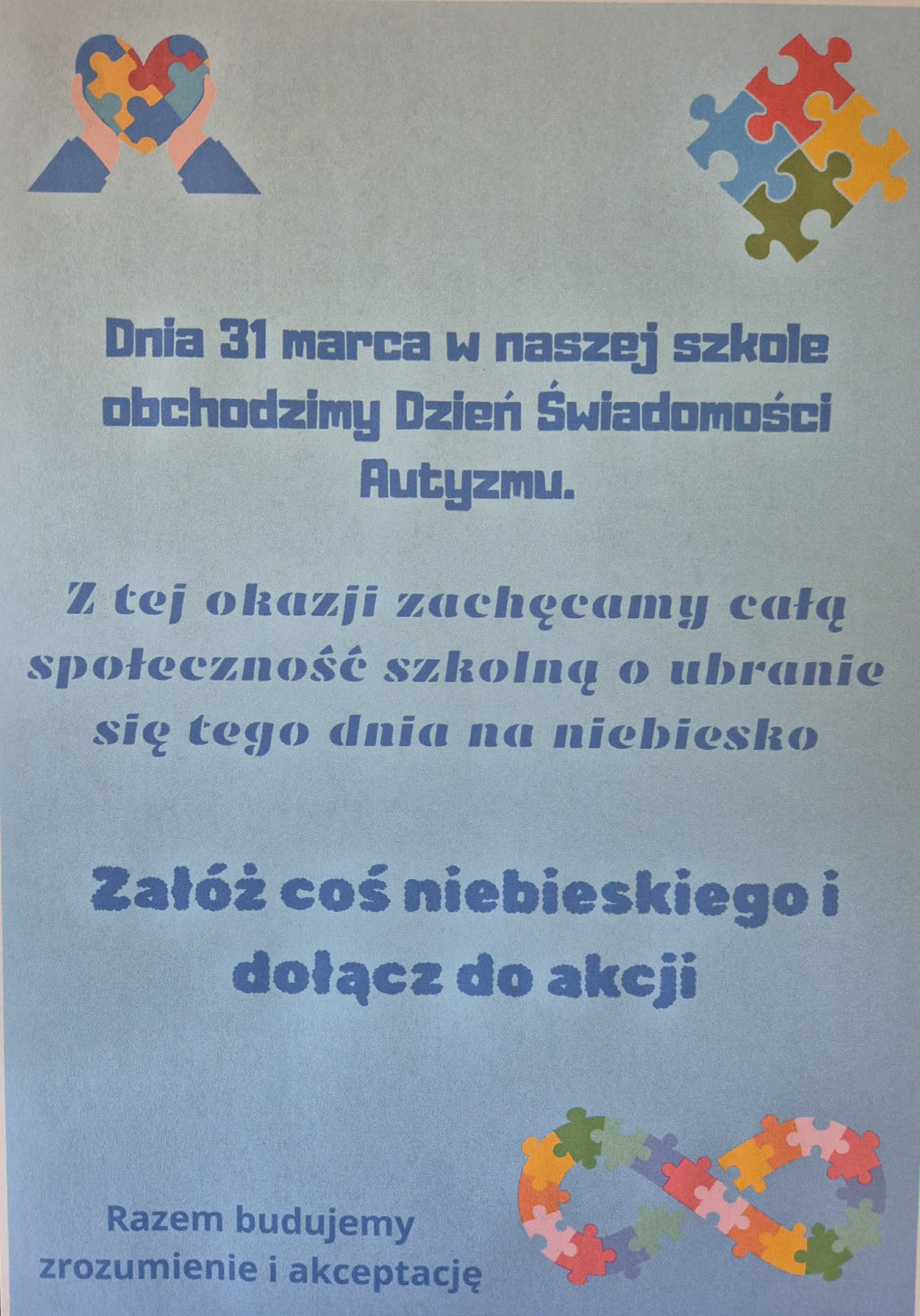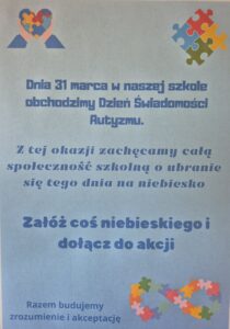 Dzień Świadomości Autyzmu – załóż coś niebieskiego i dołącz do akcji! Wysłane przez azawadka Kategorie Aktualności, Przedszkole Data 2026-03-23 Udostępnij: azawadka Poprzedni post Konkurs z okazji Światowego Dnia Świadomości Autyzmu 2026-03-23 Następny wpis Gofry na słono? – wyjątkowe warsztaty kulinarne dla uczniów klasy IV 2026-03-23