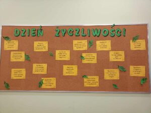 W szkole pojawiły się gazetki tematyczne dotyczące życzliwości i tego, jak ważna jest ona w życiu każdego człowieka. Uczniowie klas I – III oraz IV – VIII mogli w tym dniu napisać coś miłego drugiej osobie. Na korytarzu czekała na nich skrzynka, do której mogli wrzucać karteczki z życzliwymi słowami. Później te karteczki zostały posegregowane i rozdane adresatom.