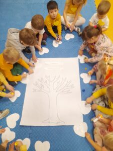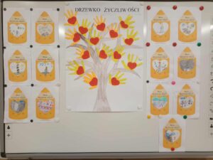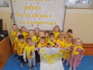 W listopadzie nasze przedszkole wzięło udział w obchodach Dnia Życzliwości, podczas którego dzieci poznawały znaczenie dobrych słów, miłych gestów i wzajemnej uprzejmości. Dzieci oraz nauczyciele ubrali się na żółto, aby podkreślić wyjątkowy charakter tego dnia. Przedszkolaki uczestniczyły w zajęciach, podczas których rozmawiały o tym, czym jest życzliwość i jak można okazywać ją innym na co dzień. Powstały również „Drzewa Życzliwości” na których zapisano pomysły dzieci na miły gest, słowo lub czyn, którym można obdarować innych. Dzień Życzliwości był dla dzieci okazją do nauki, zabawy i wspólnego działania.