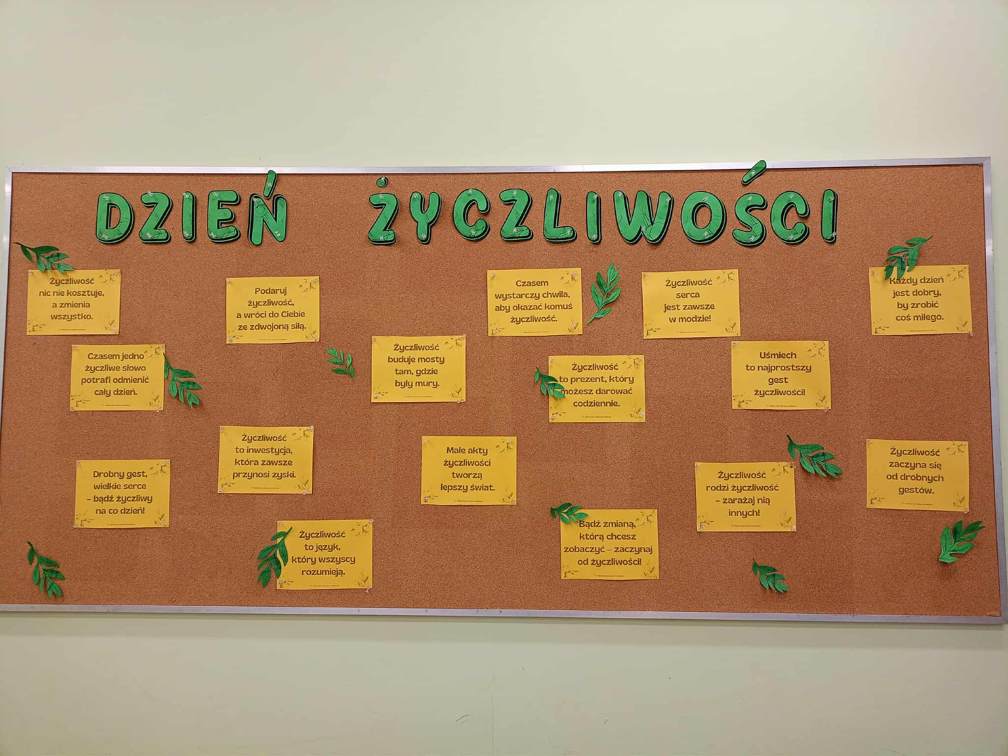 W szkole pojawiły się gazetki tematyczne dotyczące życzliwości i tego, jak ważna jest ona w życiu każdego człowieka. Uczniowie klas I – III oraz IV – VIII mogli w tym dniu napisać coś miłego drugiej osobie. Na korytarzu czekała na nich skrzynka, do której mogli wrzucać karteczki z życzliwymi słowami. Później te karteczki zostały posegregowane i rozdane adresatom.