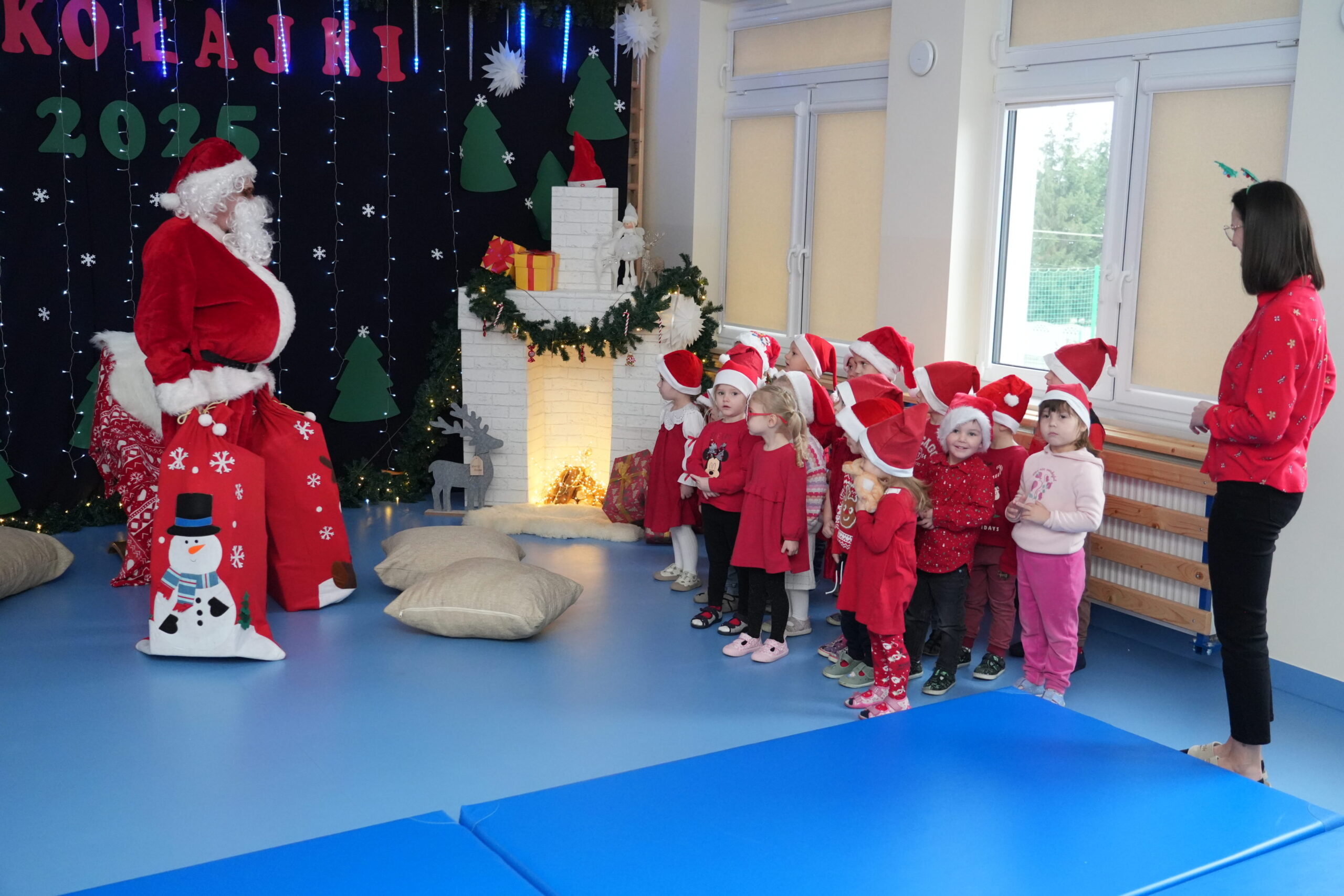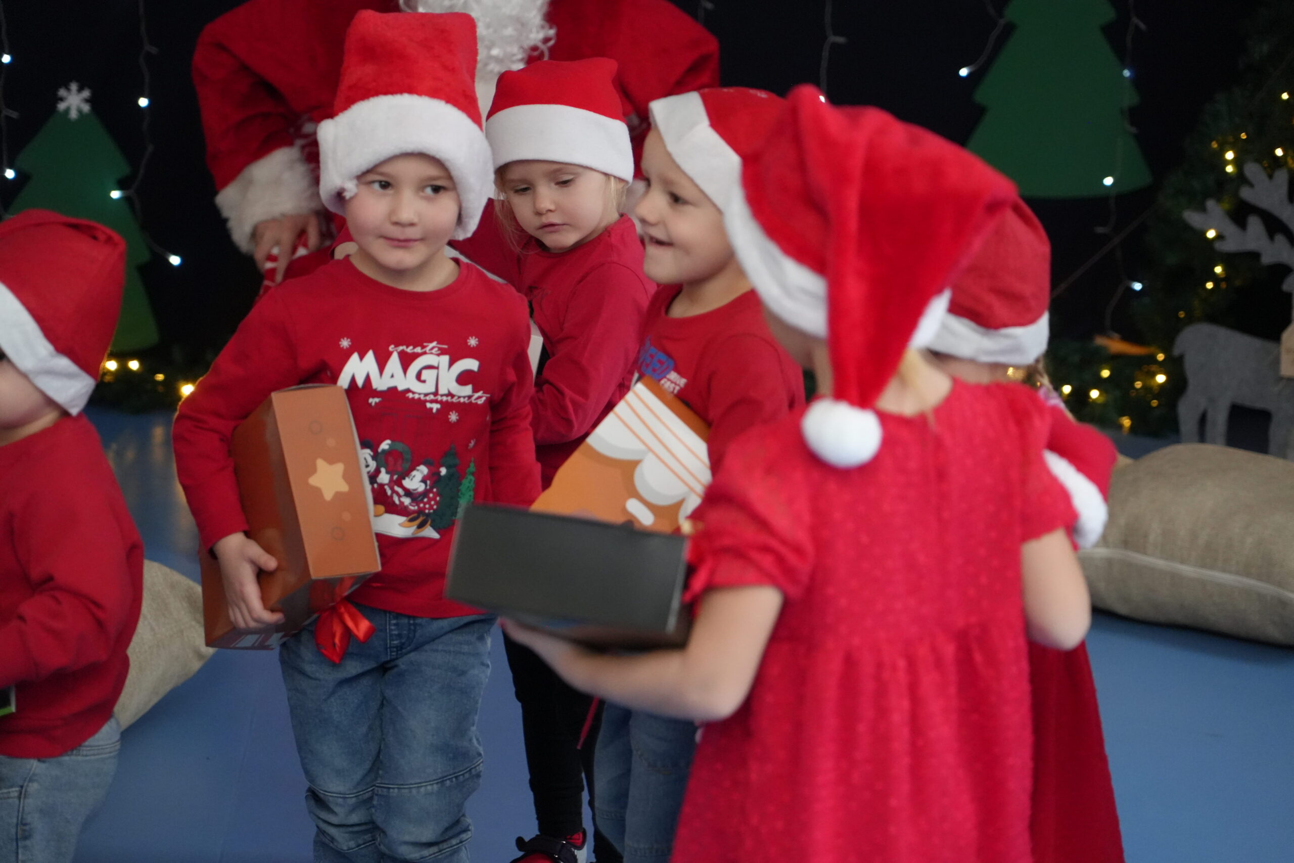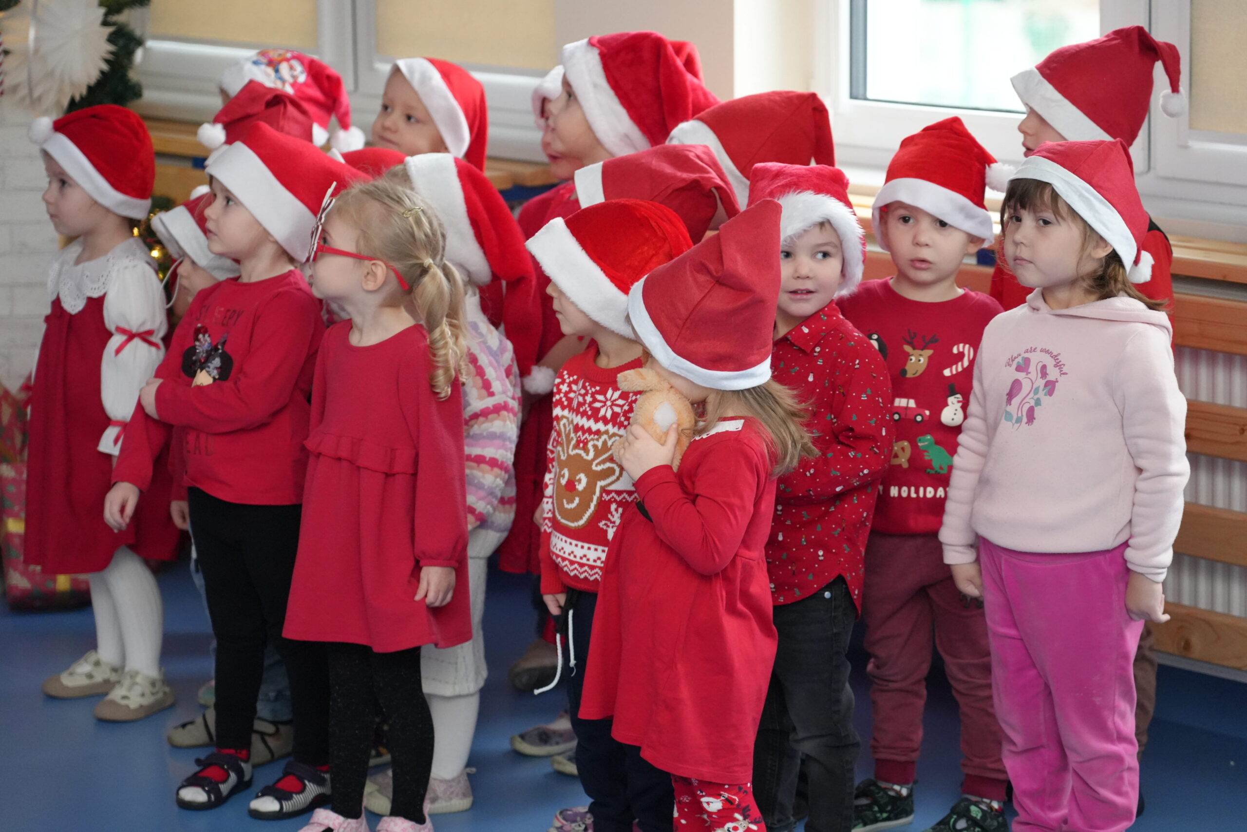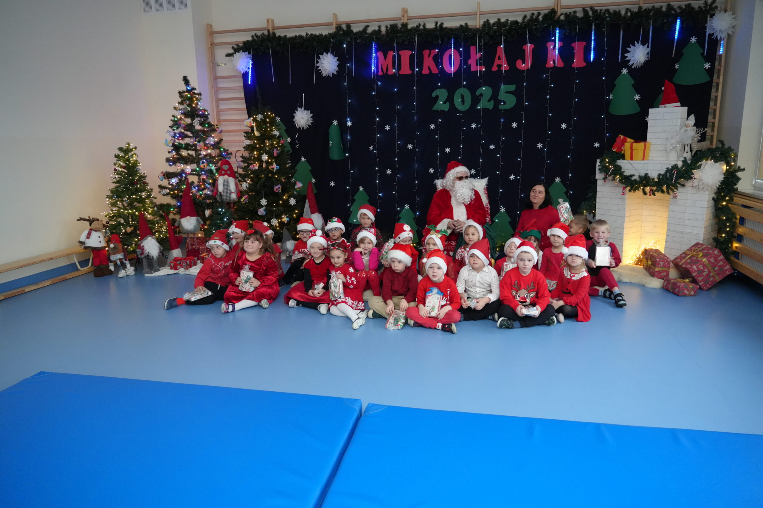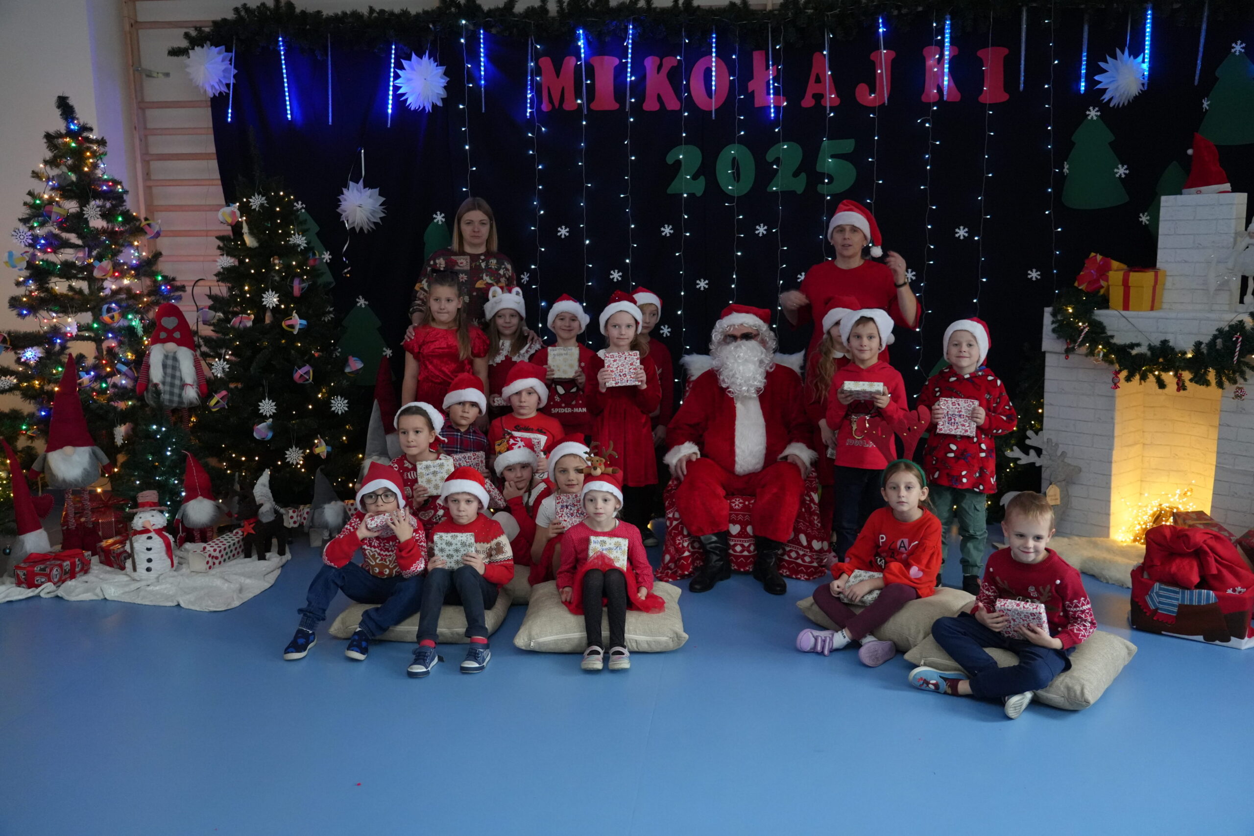 5 grudnia 2025r. w naszym przedszkolu odbyły się wyjątkowe Mikołajki, które przyniosły dzieciom mnóstwo radości i niezapomnianych wrażeń. Dzieci przyszły tego dnia ubrane na czerwono, a na głowach dumnie nosiły czapki mikołajowe, wprowadzając magiczny, świąteczny nastrój. Dzięki zaangażowaniu mam naszych przedszkolaków powstała piękna dekoracja, przy której dzieci wykonywały pamiątkowe zdjęcia. Nie zabrakło także artystycznych występów – dzieci śpiewały wesołe piosenki i recytowały wiersze specjalnie dla Mikołaja, który wręczył wszystkim dzieciom prezenty. To był dzień pełen radości i świątecznej magii, który na długo pozostanie w pamięci naszych przedszkolaków.